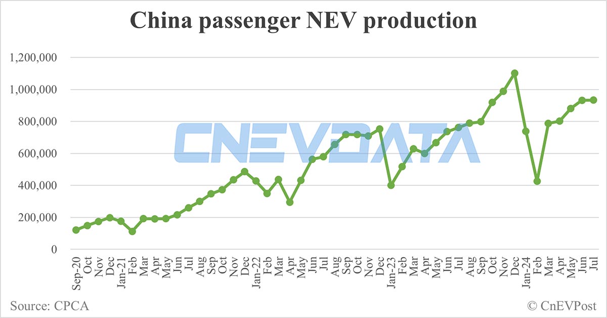China's passenger NEV production in July was 933,000 units, up 21.7 percent year-on-year and flat from June.
