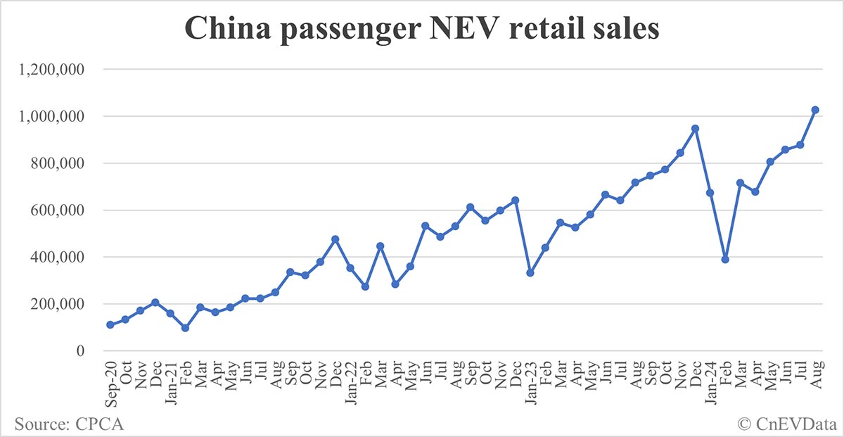 BEVs accounted for 56.8 percent of all NEV retail sales in August with 583,000 units sold.