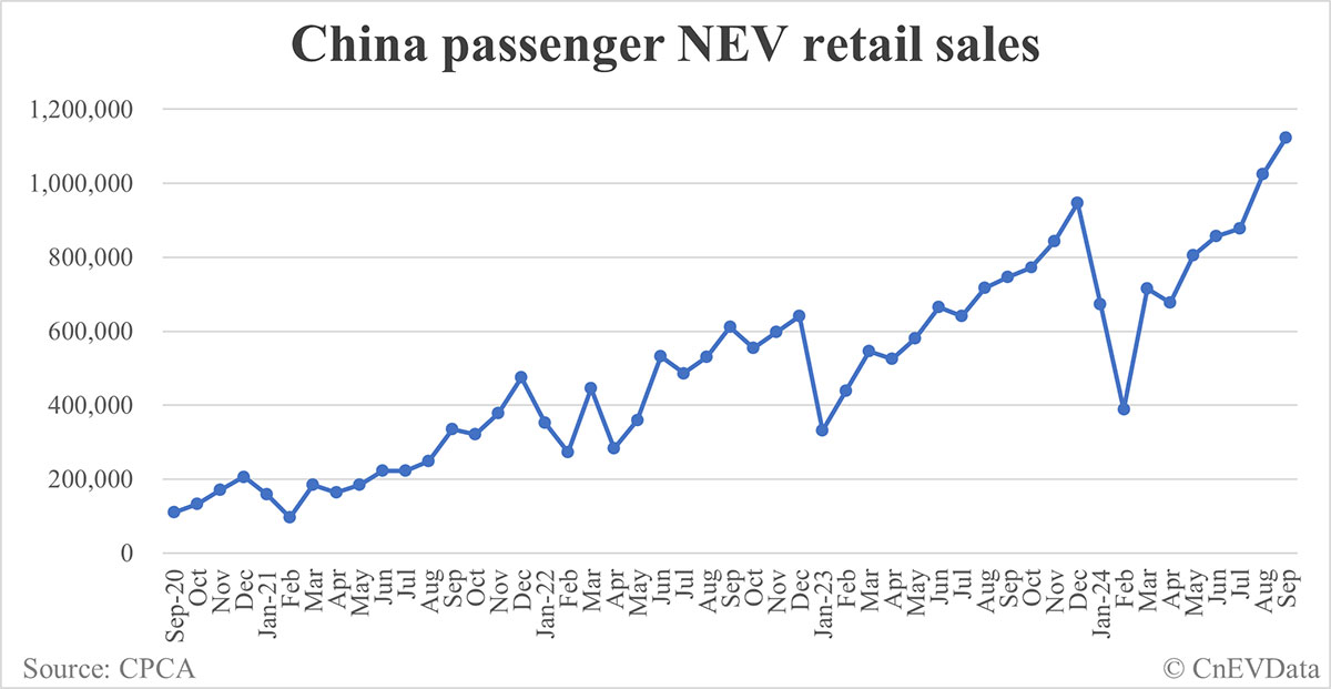 Retail sales of BEVs in September totaled 644,000 units, accounting for 57.3 percent of all NEV retail sales.