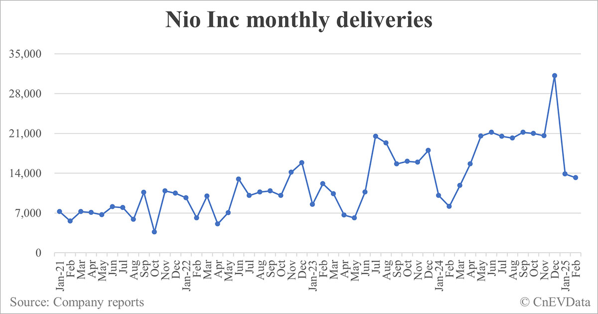 Nio delivered 13,863 vehicles in January, up 37.87 percent year-on-year but 55.48 percent lower than in December.