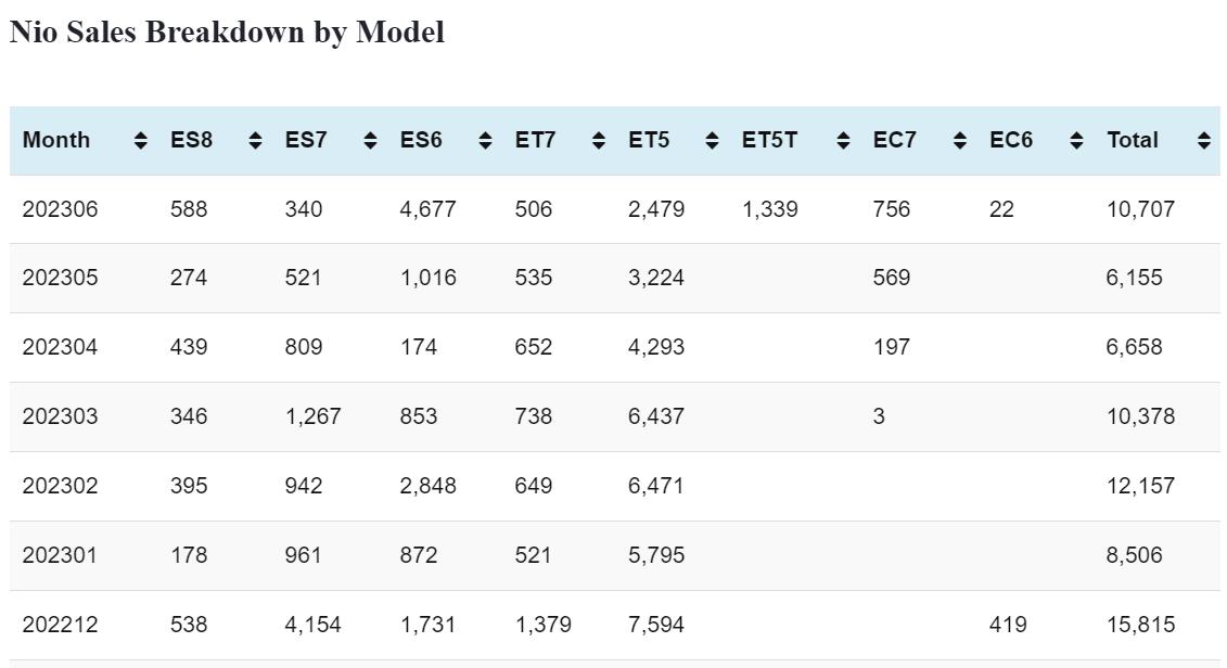 Nio Jun sales breakdown by model: ES6 4,677, ET5 2,479