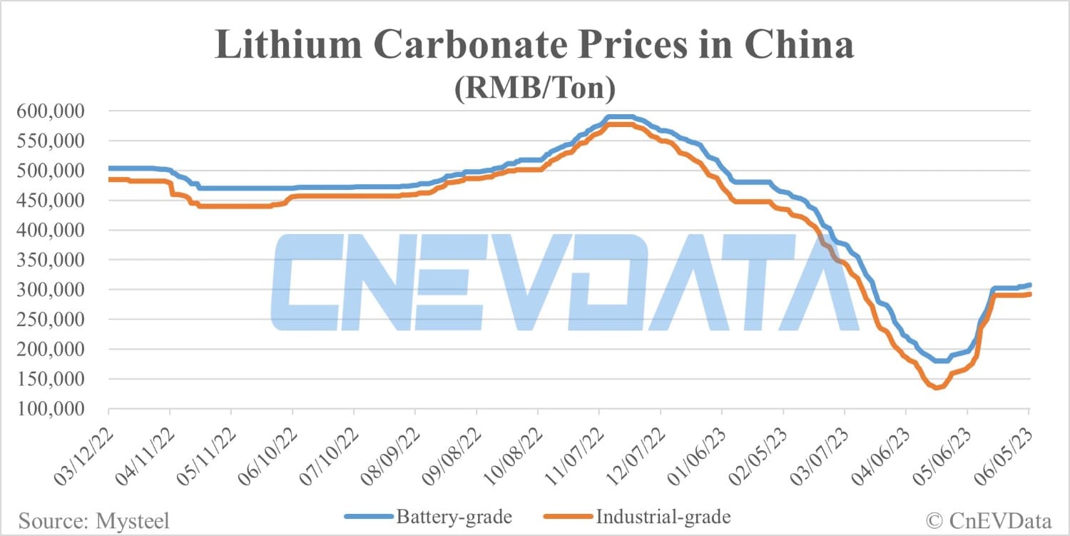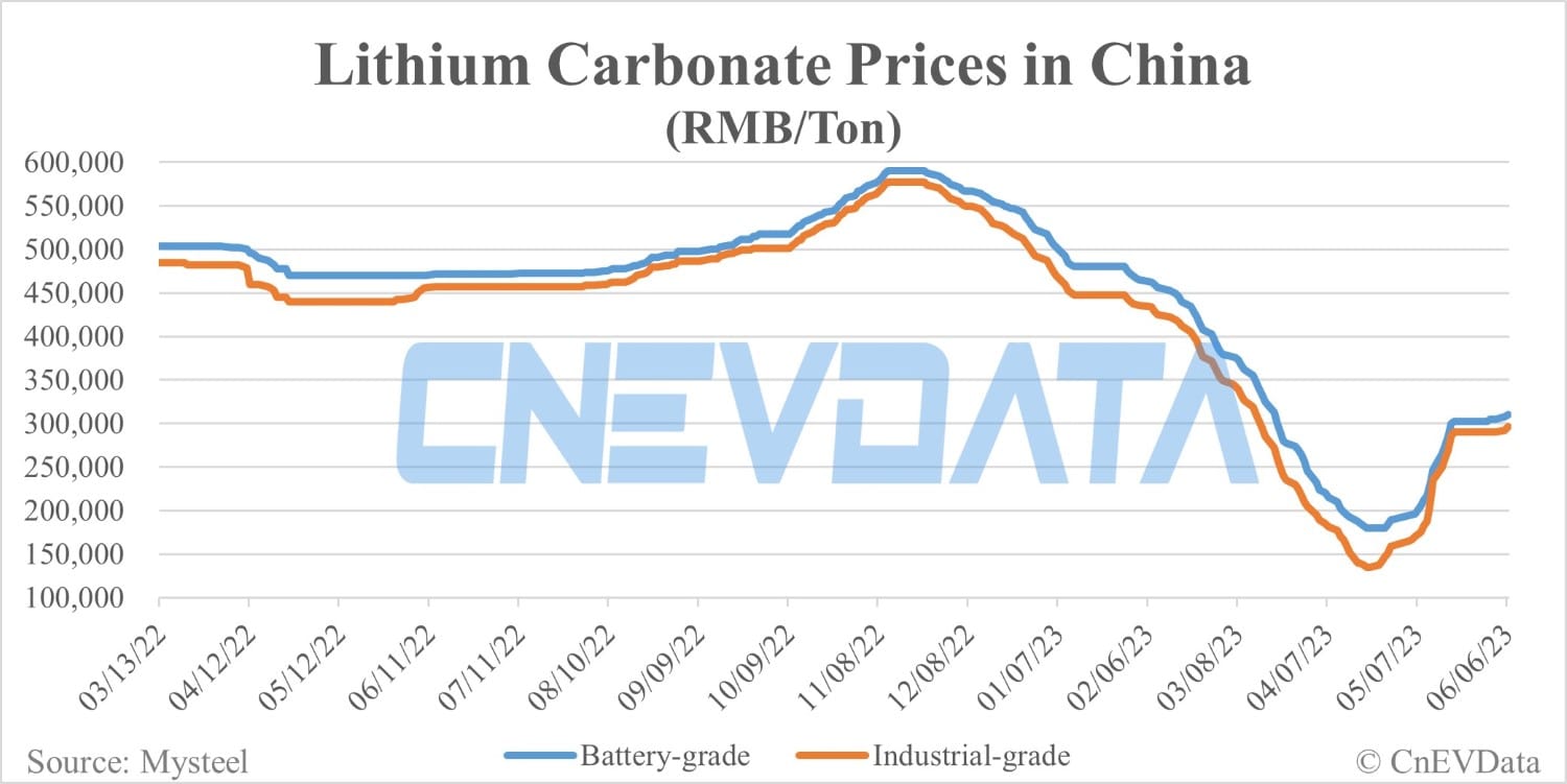 Battery-grade lithium carbonate and industrial-grade lithium carbonate prices in China were both up RMB 2,500 per ton today.