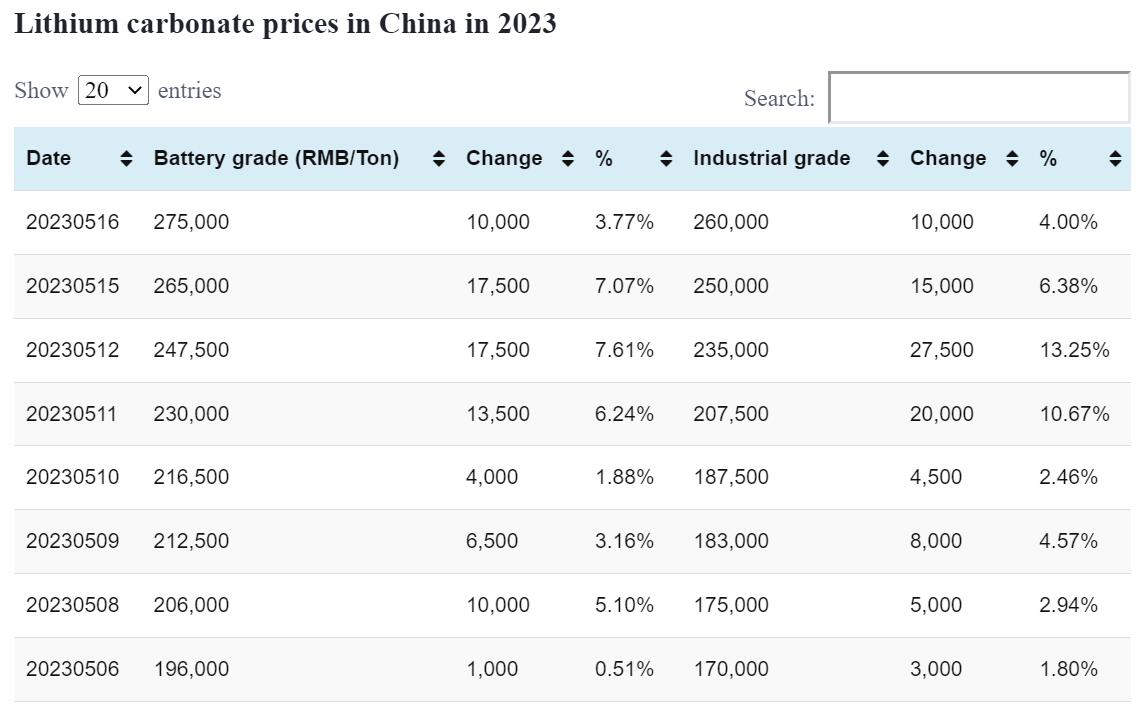 Industrial-grade lithium carbonate rose by RMB 10,000 per ton to an average price of RMB 270,000 per ton today.