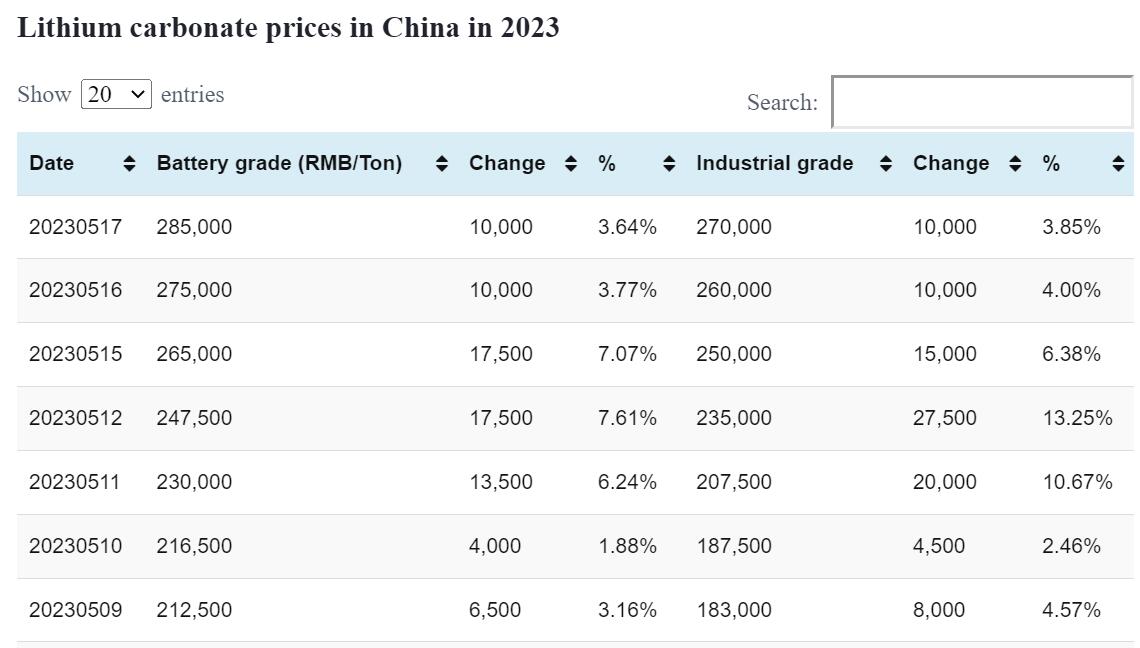 Industrial-grade lithium carbonate rose by RMB 15,000 per ton to an average price of RMB 285,000 per ton today.