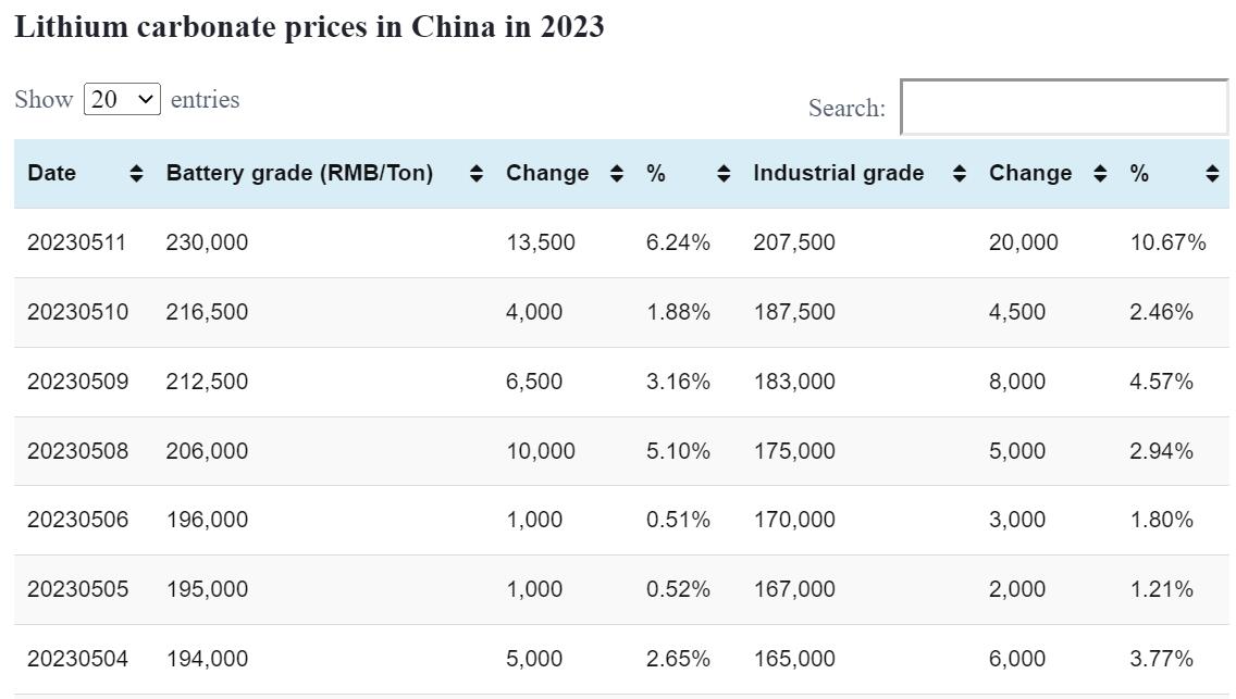 Industrial grade lithium carbonate rose by RMB 20,000 per ton to an average price of RMB 207,500 per ton today.