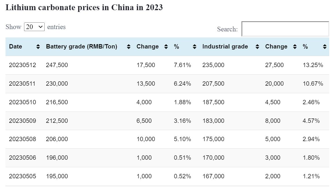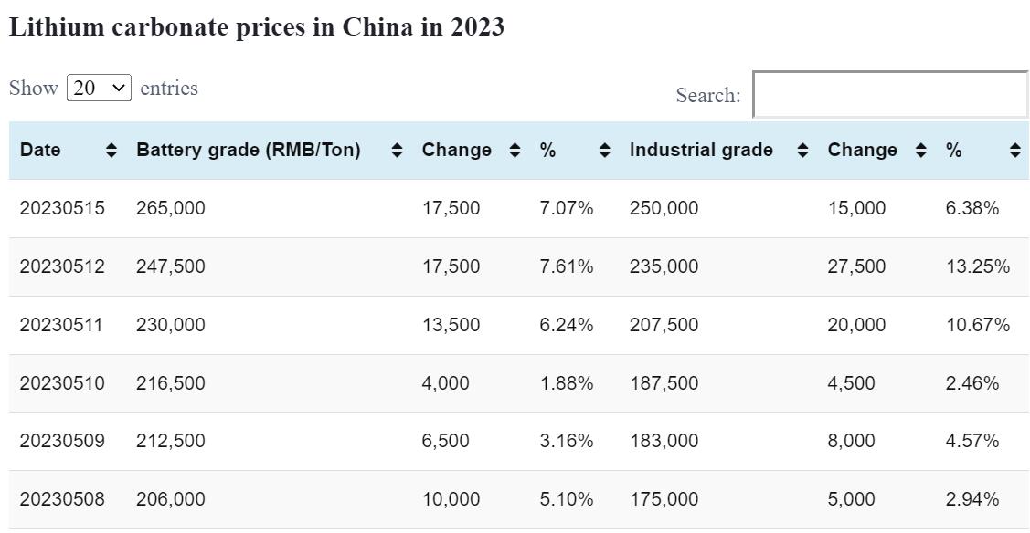 Industrial grade lithium carbonate rose by RMB 15,000 per ton to an average price of RMB 250,000 per ton today.