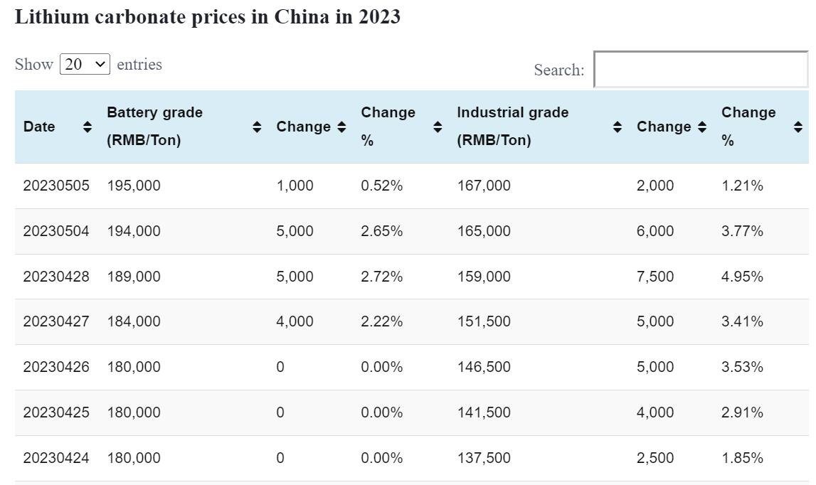 Industrial-grade lithium carbonate rose RMB 2,000 per ton to an average price of RMB 167,000 per ton today.