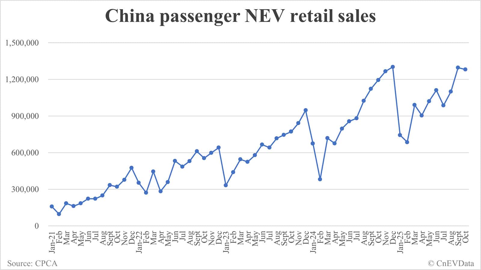 China Oct NEV retail data by CPCA: 1,282,000