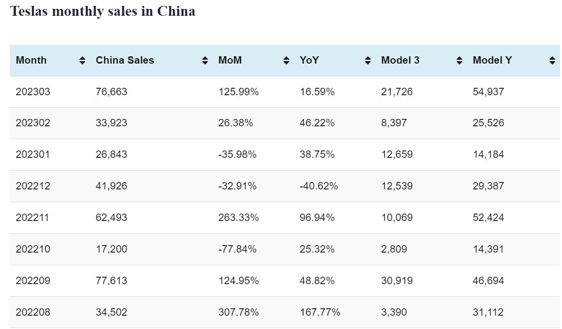 Tesla deliveries in China in Mar: 76,663