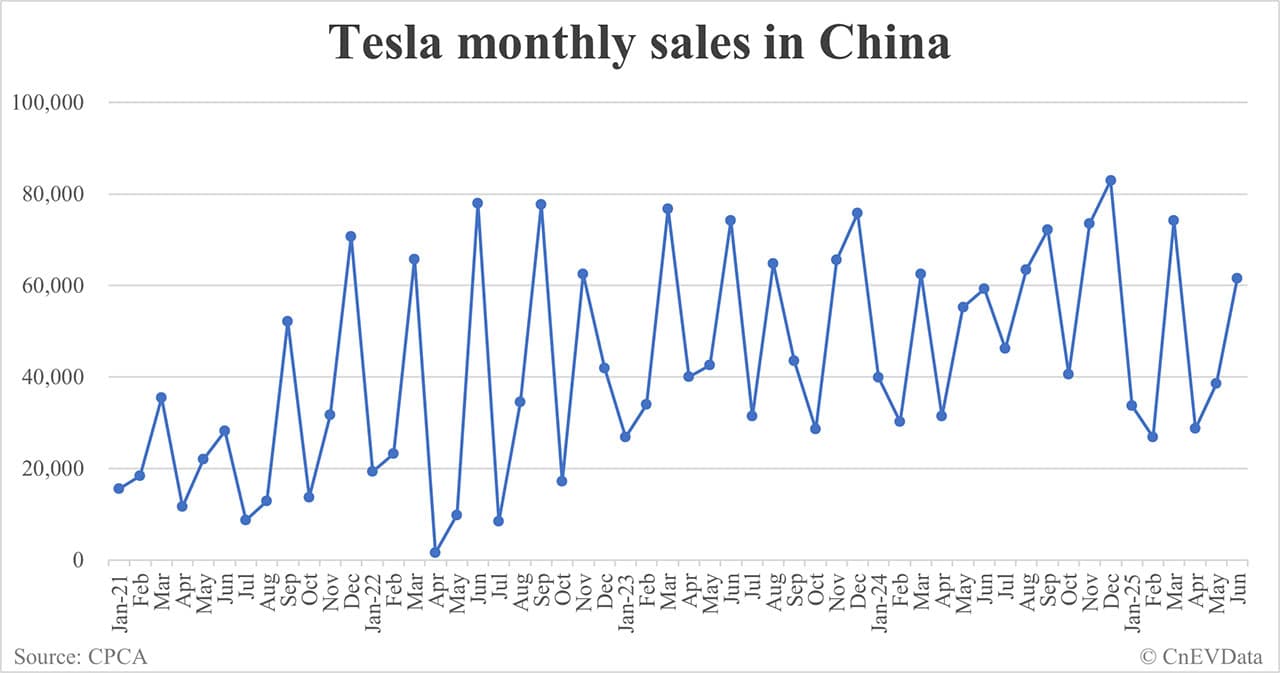 In the first six months, Tesla's retail sales in China were 263,410 vehicles, down 5.36 percent year-on-year.