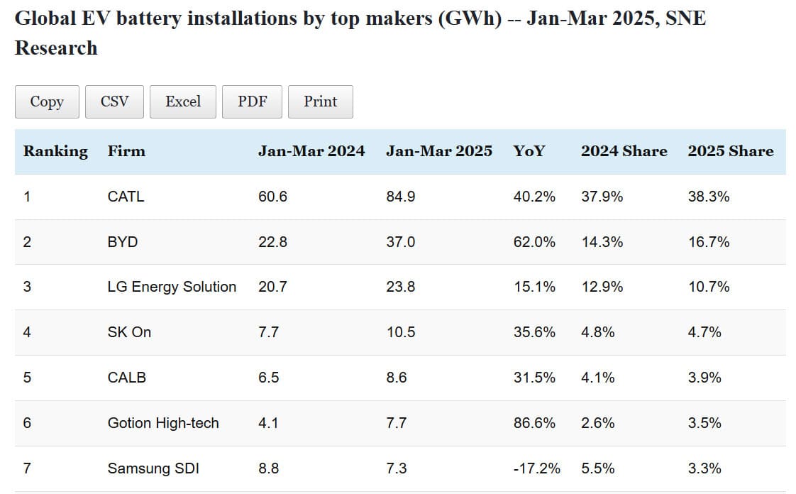 Data table: Top EV battery makers' global installations in Jan-Mar 2025