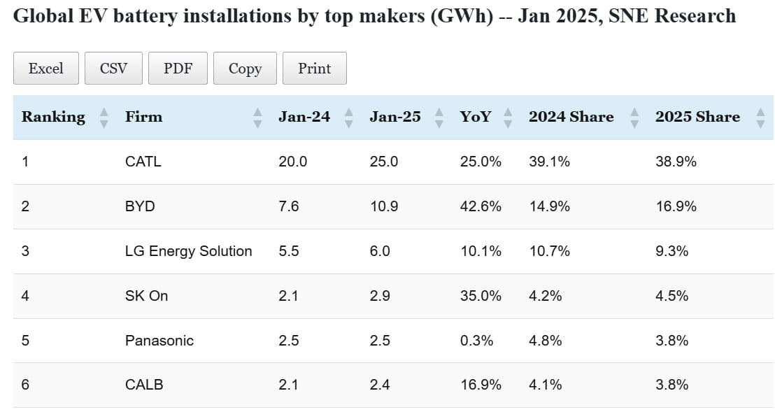 Data table: Top EV battery makers' global installations in Jan 2025