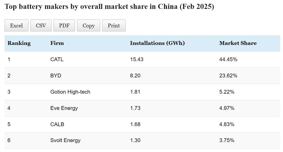Data table: Top EV battery makers' installations in China in Feb 2025