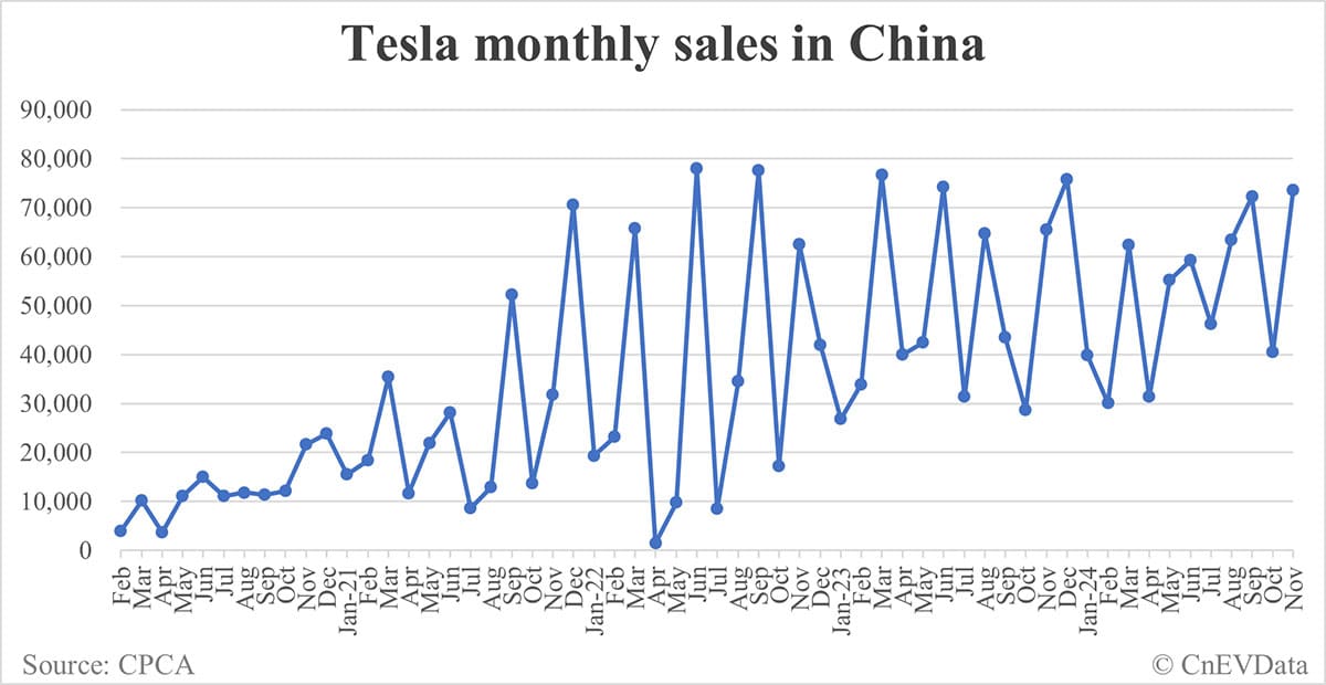 Tesla's retail sales in China in November were 73,490 vehicles, up 12.19 percent year-on-year and up 81.52 percent from October.