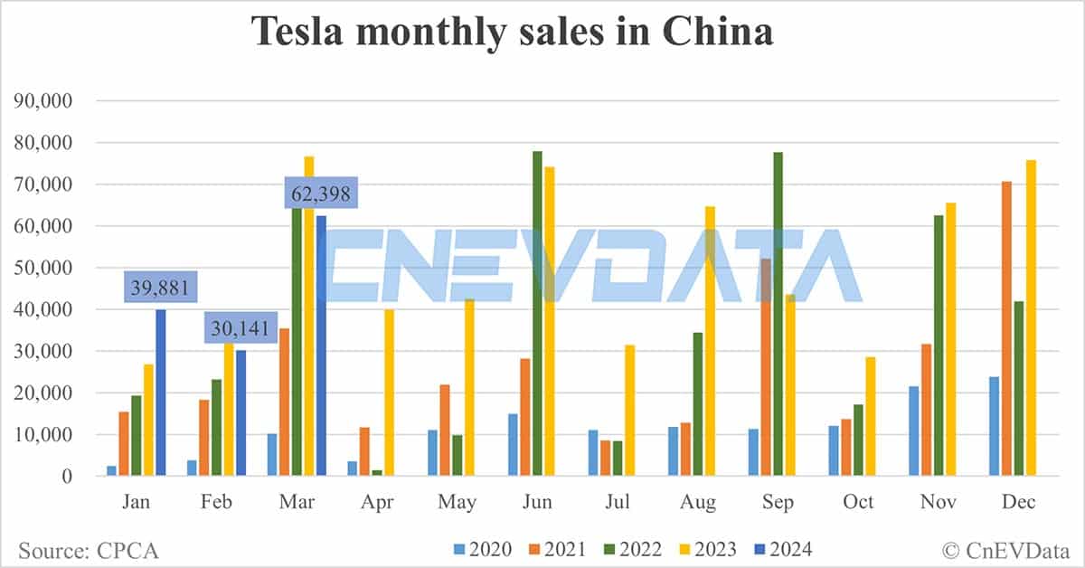 Tesla sold 70,022 vehicles in China in January-February, up 15.23 percent year-on-year.