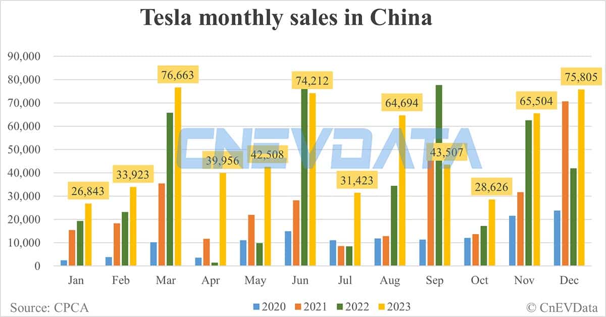In 2023, Tesla delivered 603,664 vehicles in China, up 37.27 percent year-on-year.