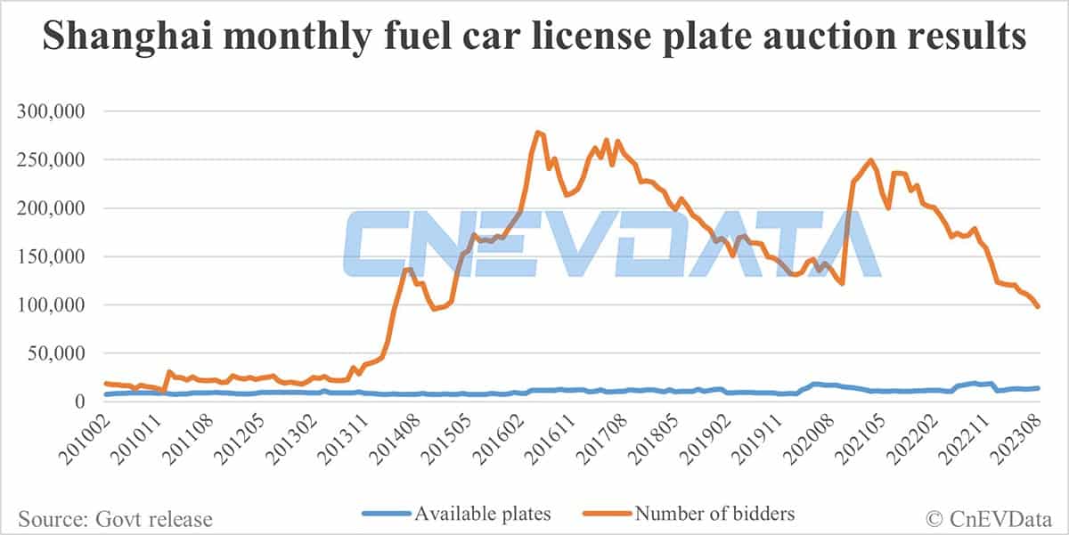 In Shanghai's August fuel vehicle license plate auction, there were 98,049 bidders, down from 106,115 in July and a new low since December 2014.