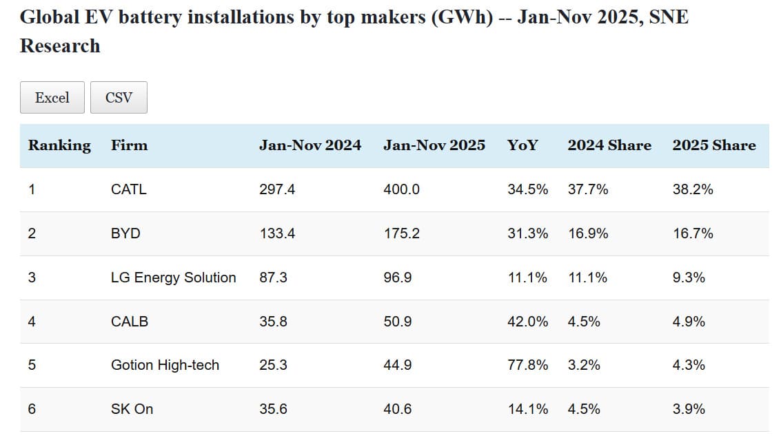 Data table: Top EV battery makers' global installations in Jan-Nov 2025