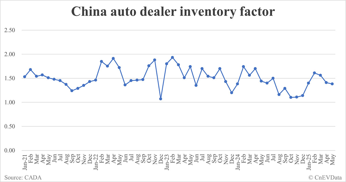 China's automobile dealer inventory factor stood below the alert line of 1.50 in May, indicating that dealer inventory levels are within a reasonable range.