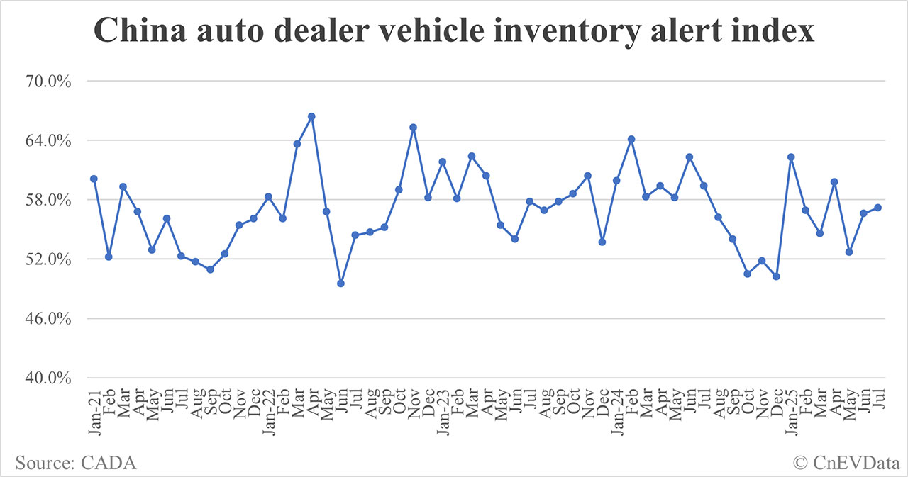 China vehicle inventory alert index rises to 57.2% in Jul