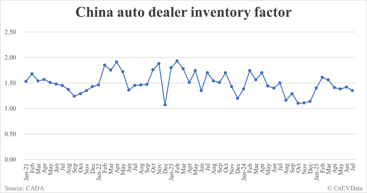 China's July automobile dealer inventory factor was 1.35, below the alert line of 1.50 but above the reasonable range.