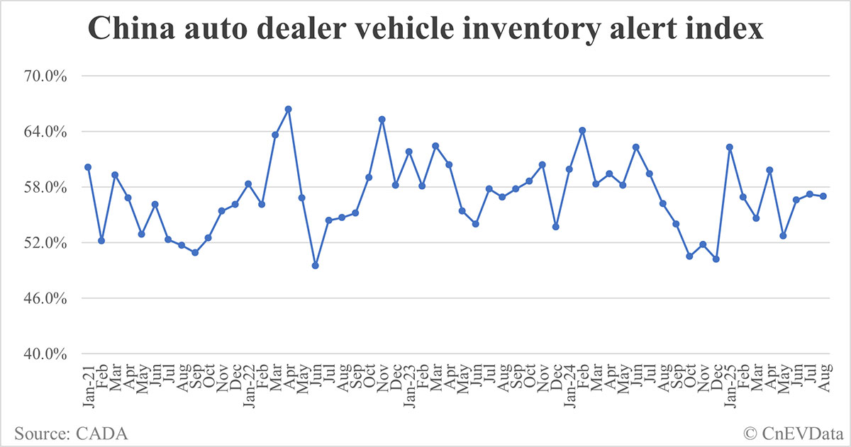 China vehicle inventory alert index drops to 57.0% in Aug