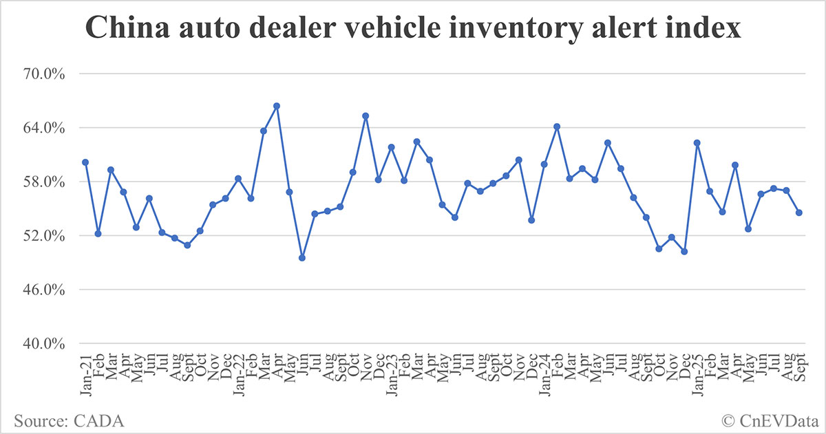 China vehicle inventory alert index drops to 54.5% in Sept