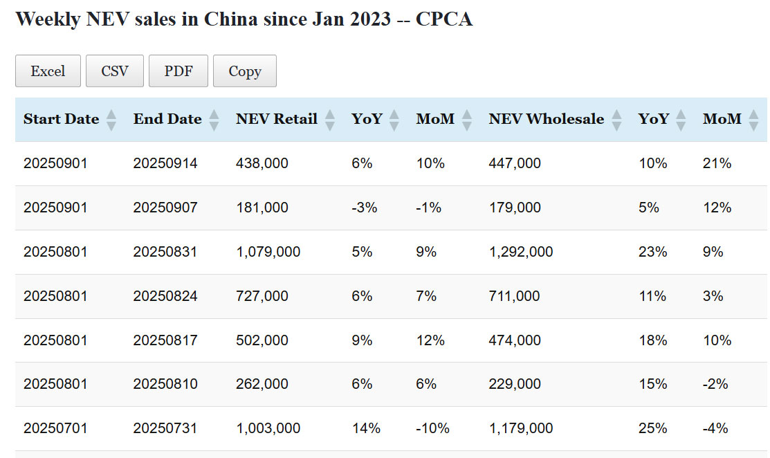 From September 1-14, China's passenger NEV retail sales totaled 438,000 units, marking a 6 percent year-on-year increase and a 10 percent month-on-month rise.