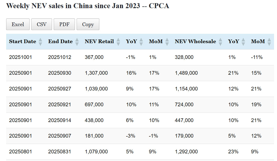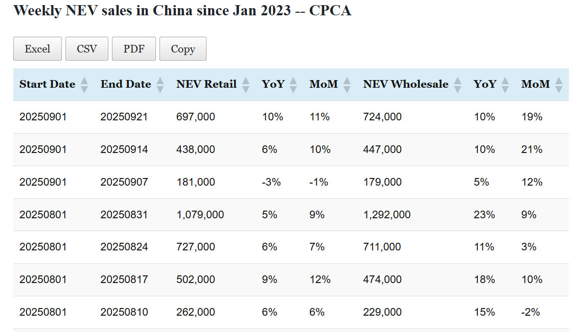 From September 1-21, China's passenger NEV retail sales reached 697,000 units, marking a 10 percent year-on-year increase and an 11 percent month-on-month rise.