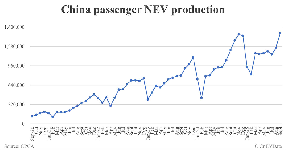 From January to September, China's passenger NEV production reached 10.38 million units, marking a 32.2 percent year-on-year increase.