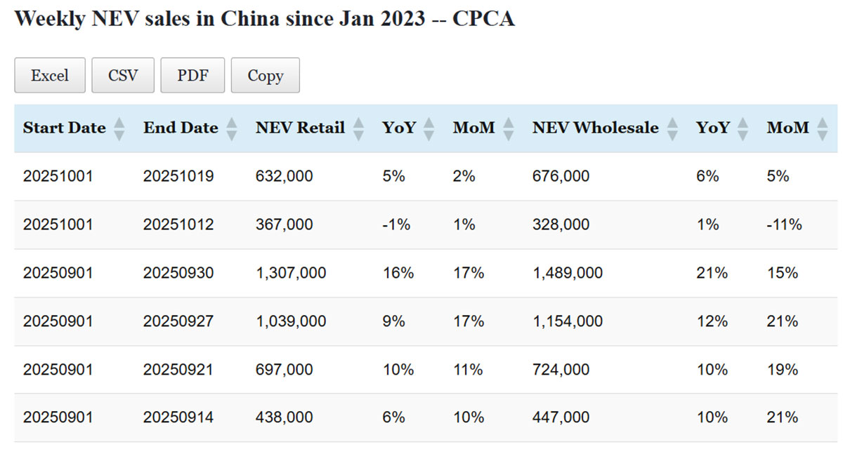 In October 1-19, China's passenger NEV retail sales reached 632,000 units, marking a 5 percent year-on-year increase and a 2 percent month-on-month rise.