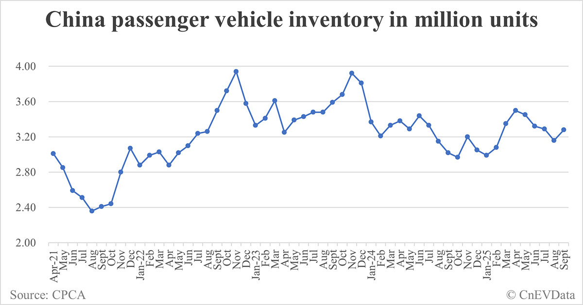 For manufacturers producing only NEVs, inventory stood at 620,000 units at the end of September, down from 650,000 units at the end of August.