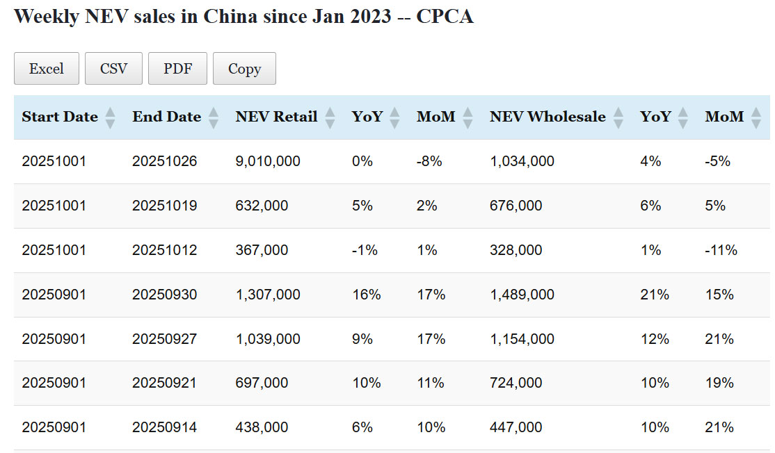 In October 1-26, China's passenger NEV retail sales totaled 901,000 units, flat year-on-year while down 8 percent month-on-month.