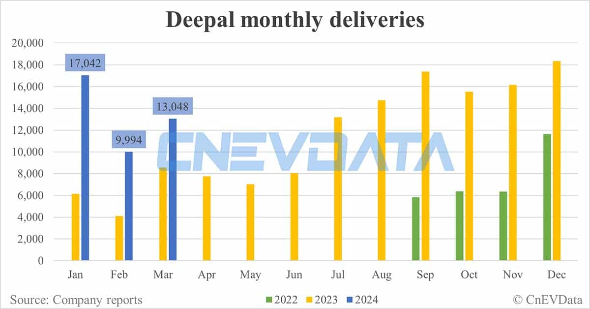 Deepal delivered 13,048 vehicles in March, up 52.29 percent year-on-year and up 30.56 percent from February.