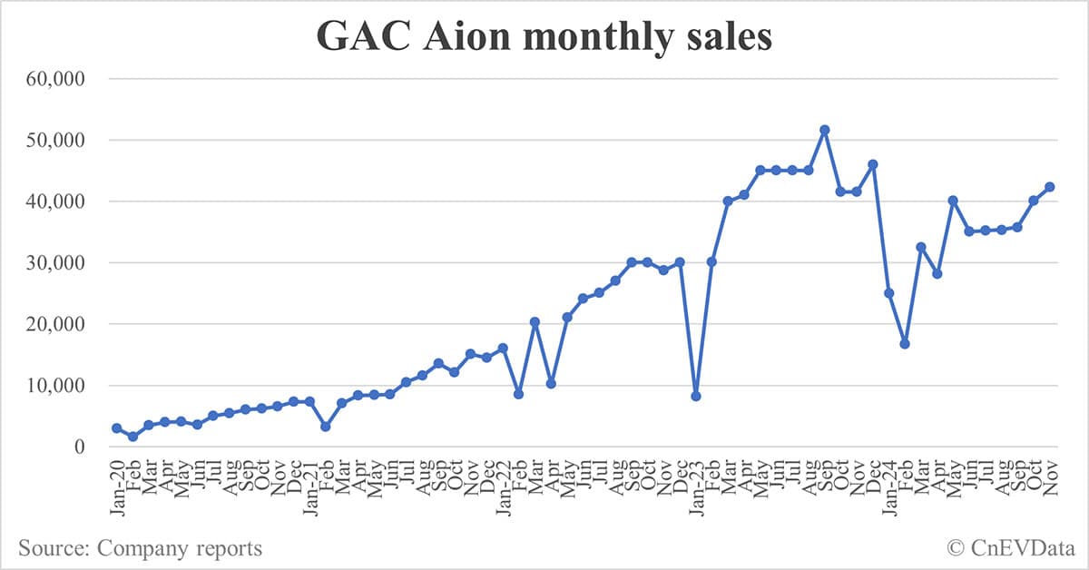 For the full year 2024, GAC Aion sold 412,943 vehicles, down 13.97 percent year-on-year.