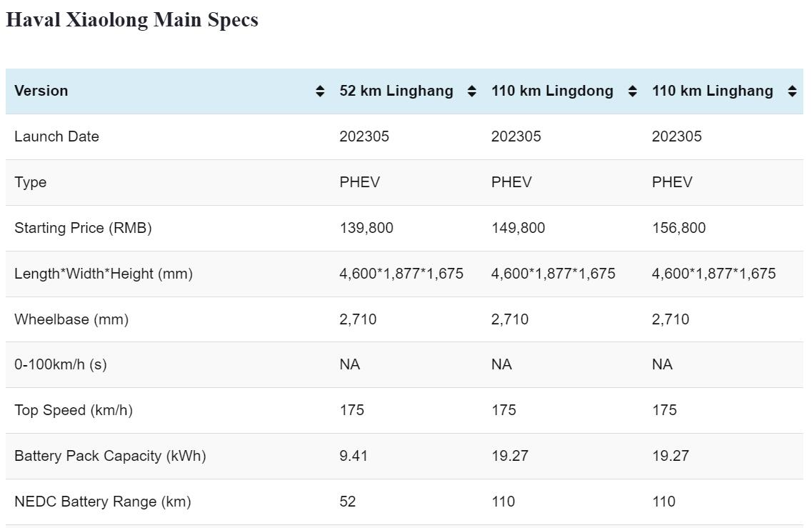 The tables in this article list the main specification information for Haval Xiaolong and Haval Xiaolong Max.