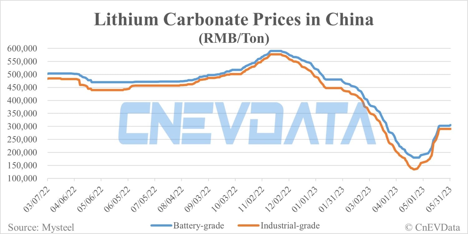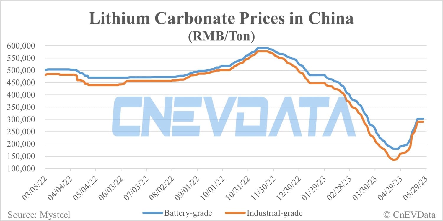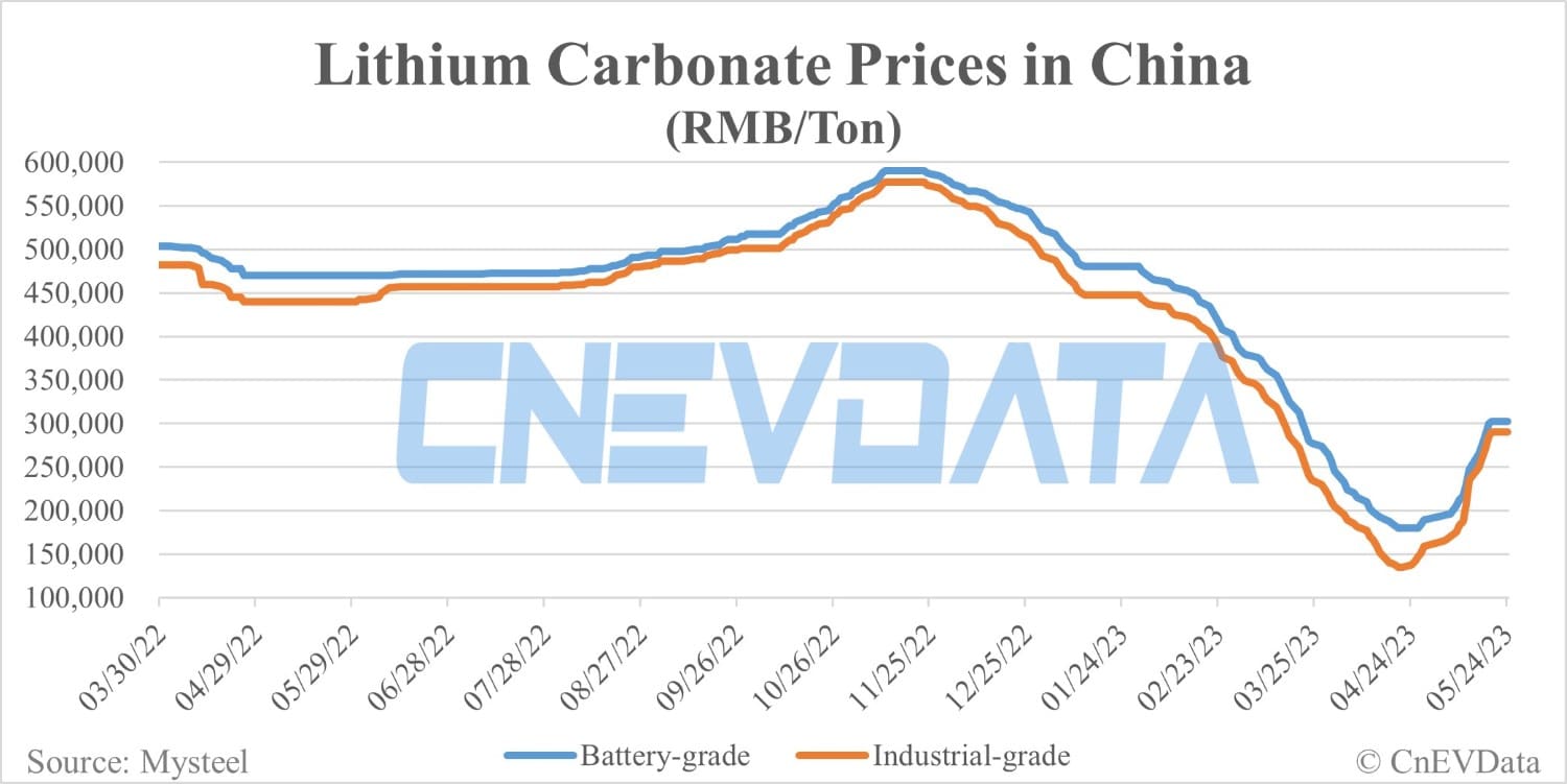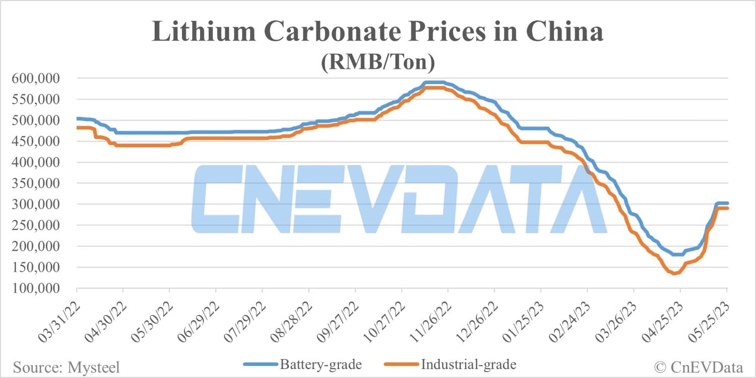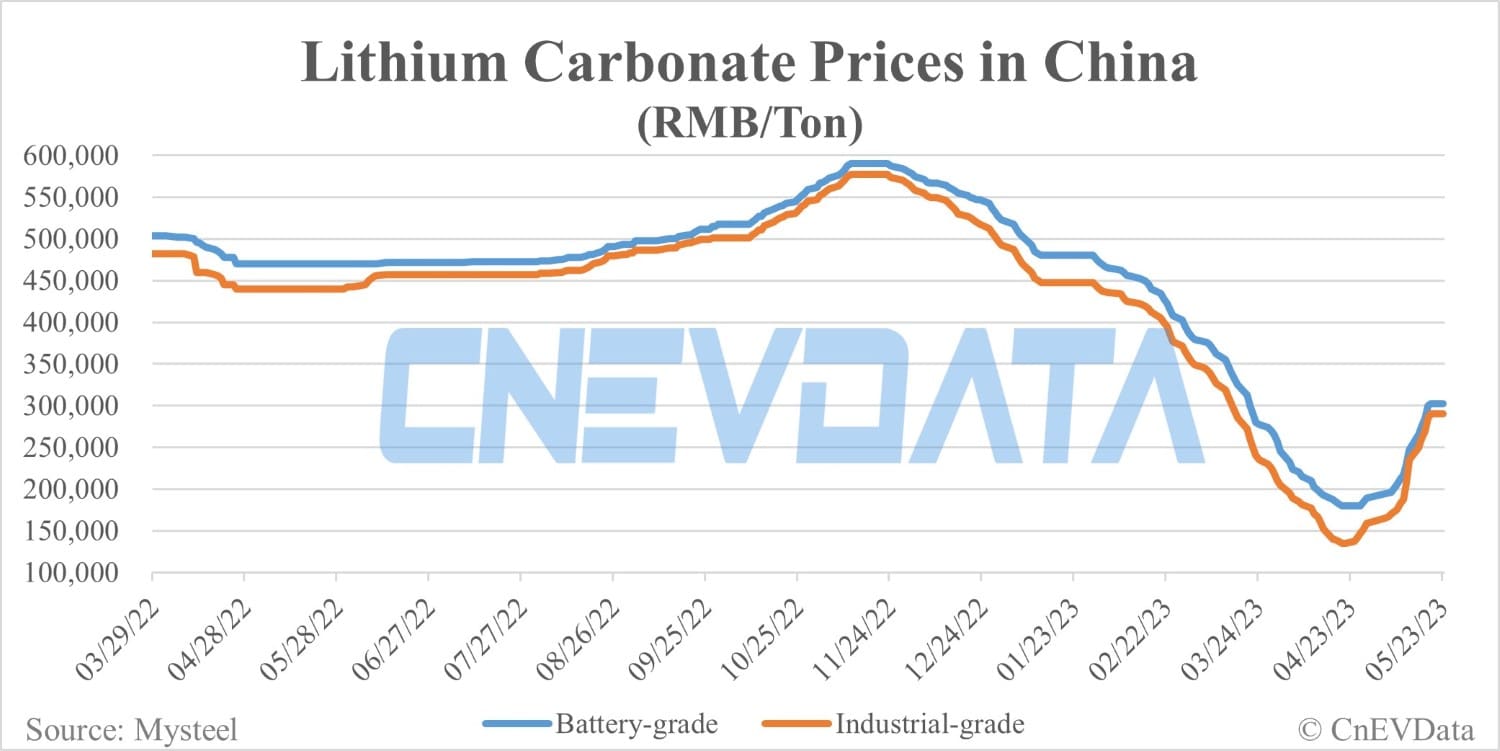 Battery-grade lithium carbonate and industrial-grade lithium carbonate prices in China were both up RMB 2,500 per ton today.