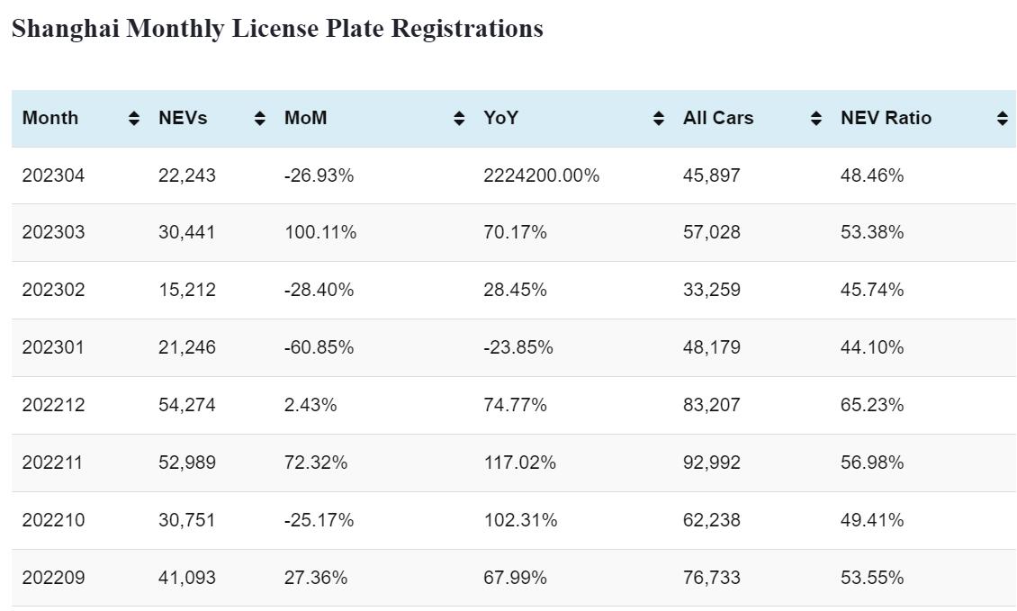 Shanghai Apr NEV license plate registrations down 27% from Mar