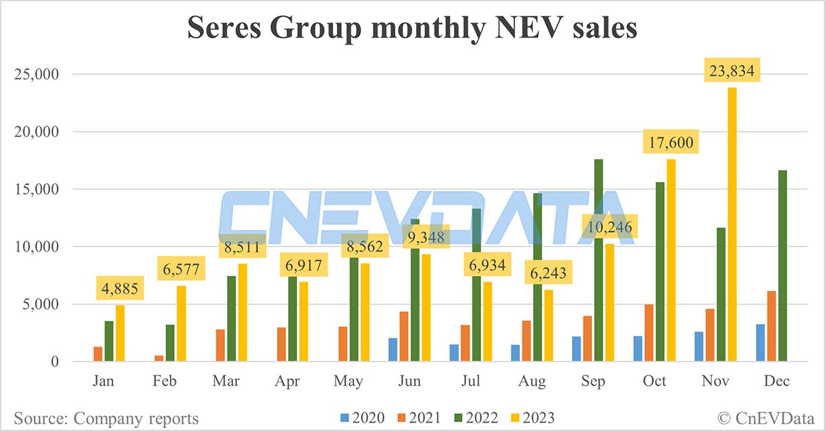 Seres Group reported NEV sales of 23,834 units in November, including 20,318 units under the Seres brand.