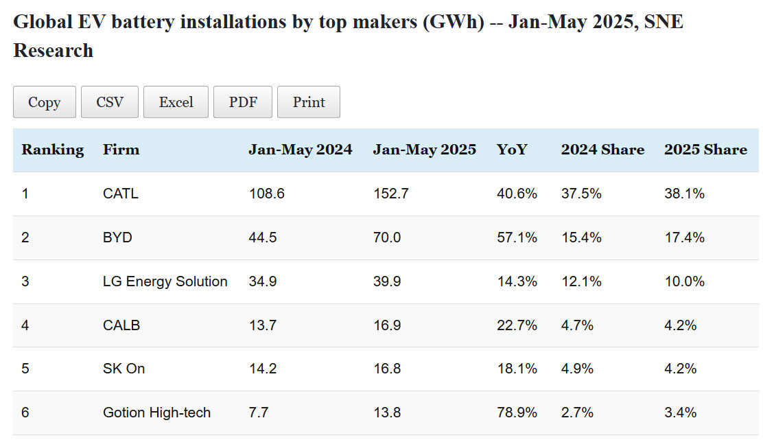 Data table: Top EV battery makers' global installations in Jan-May 2025