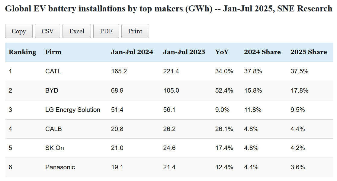 Data table: Top EV battery makers' global installations in Jan-Jul 2025