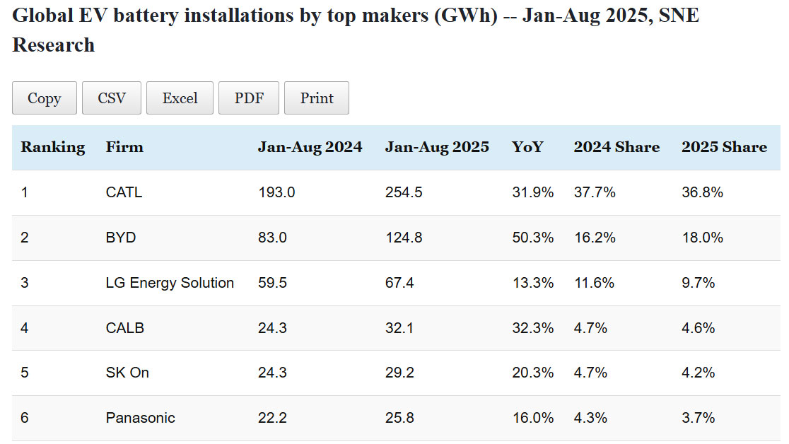 Data table: Top EV battery makers' global installations in Jan-Aug 2025