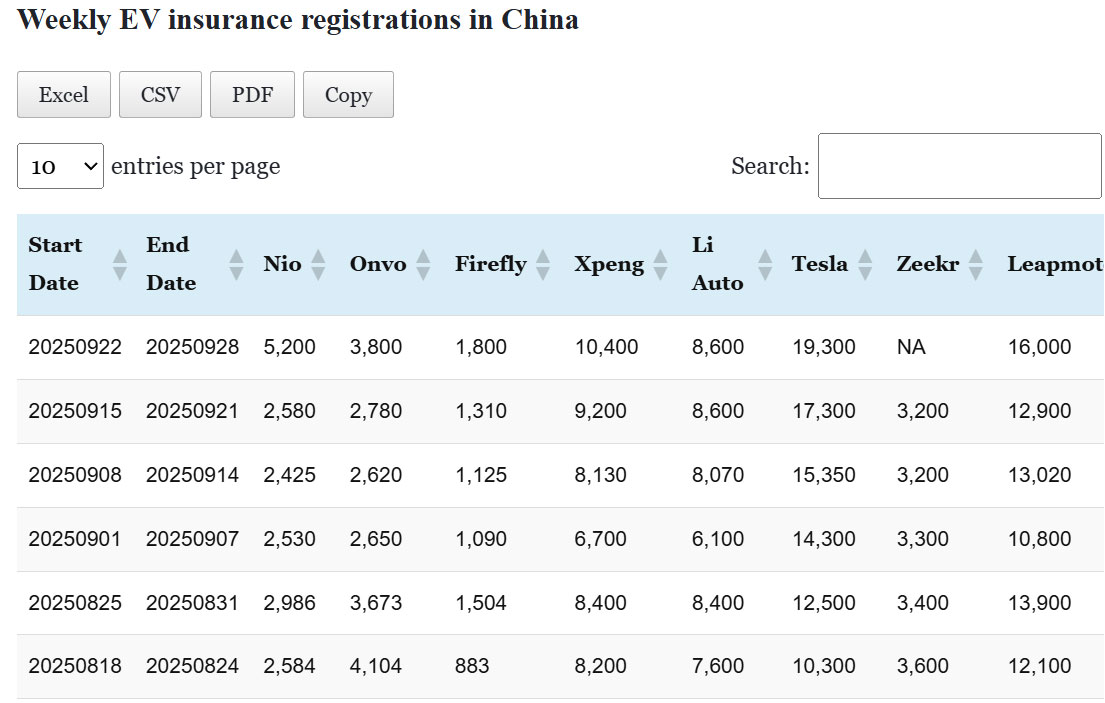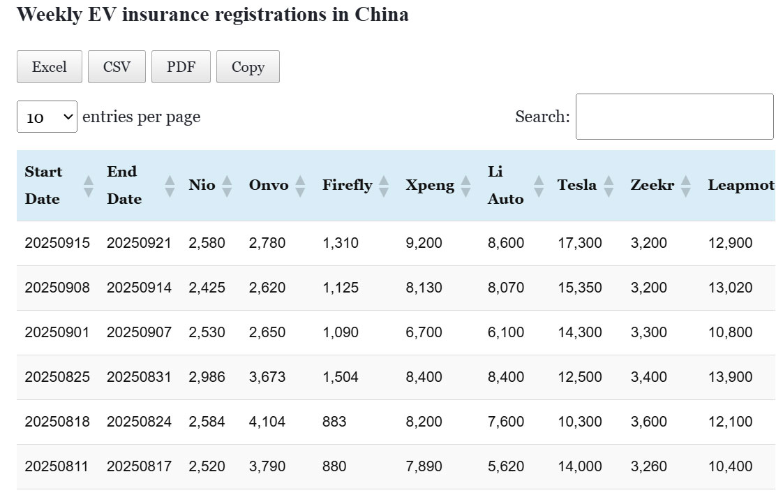 Data table: China EV insurance registrations in Sept 29-Oct 5