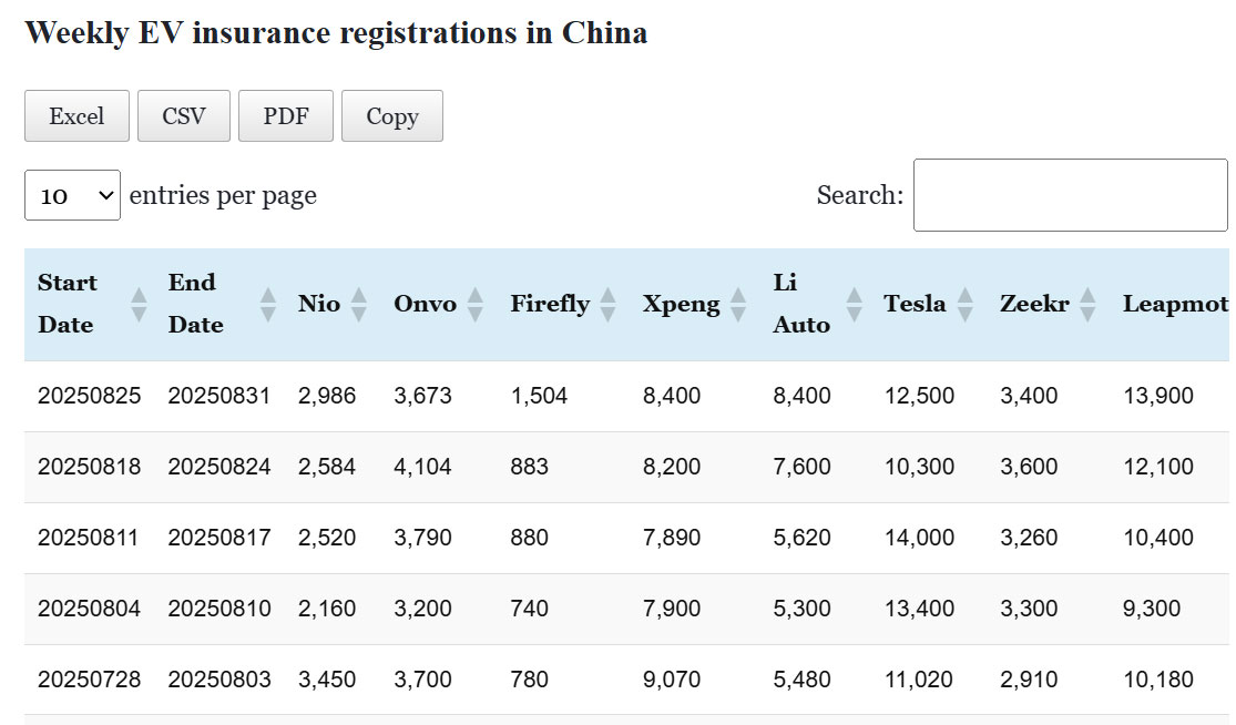Weekly insurance registrations for vehicles of Nio, Xpeng, Li Auto, Tesla, Zeekr, and Leapmotor are included in this article.
