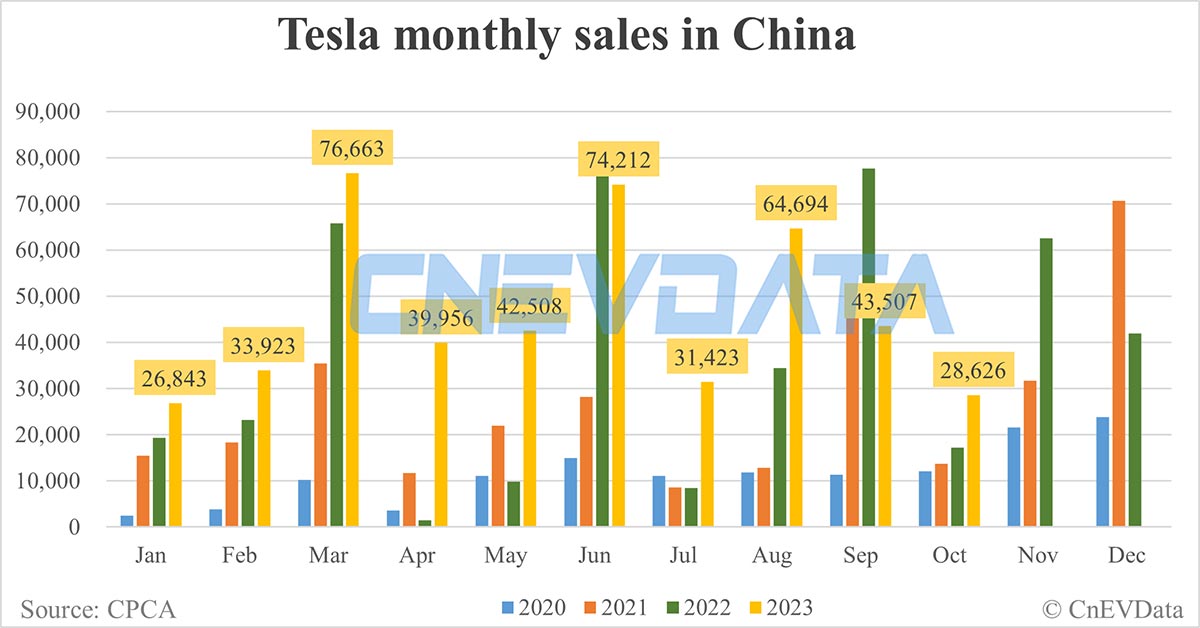 In the January-October period, Tesla delivered 462,355 vehicles in China, up 37.87 percent year-on-year.
