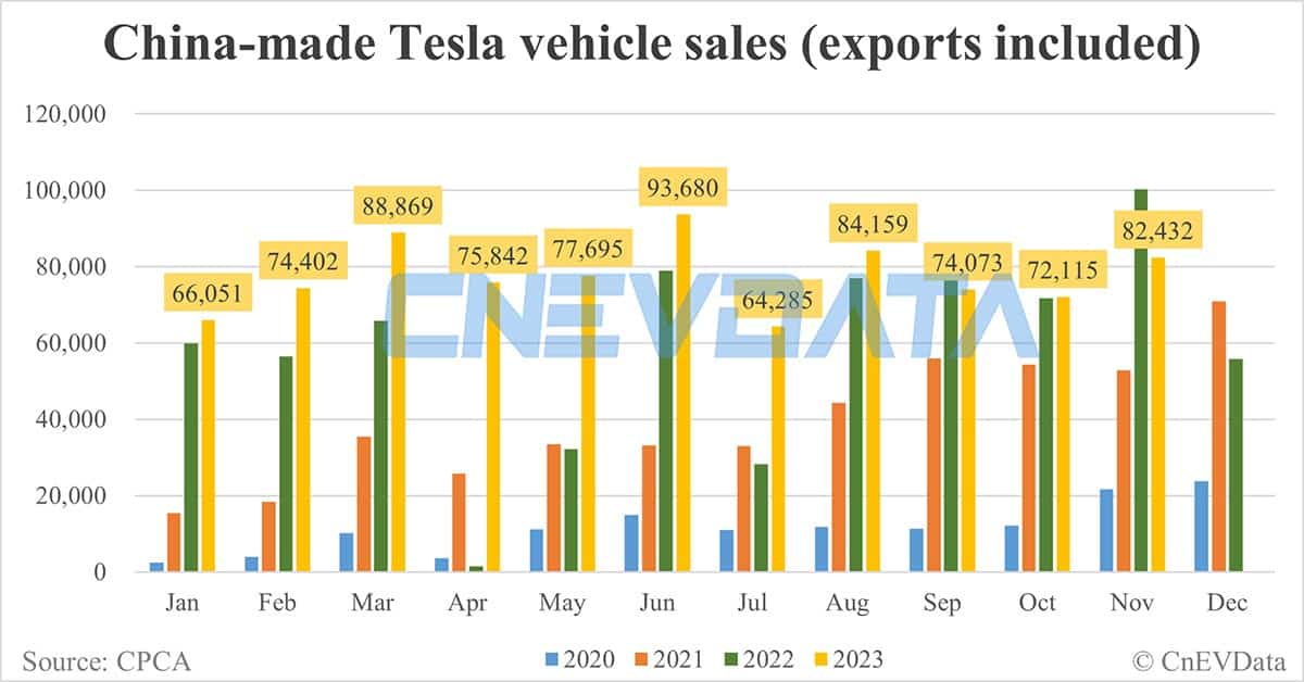 Model Y sales in China in December were up 104.36 percent from a year ago and up 20.41 percent from November.