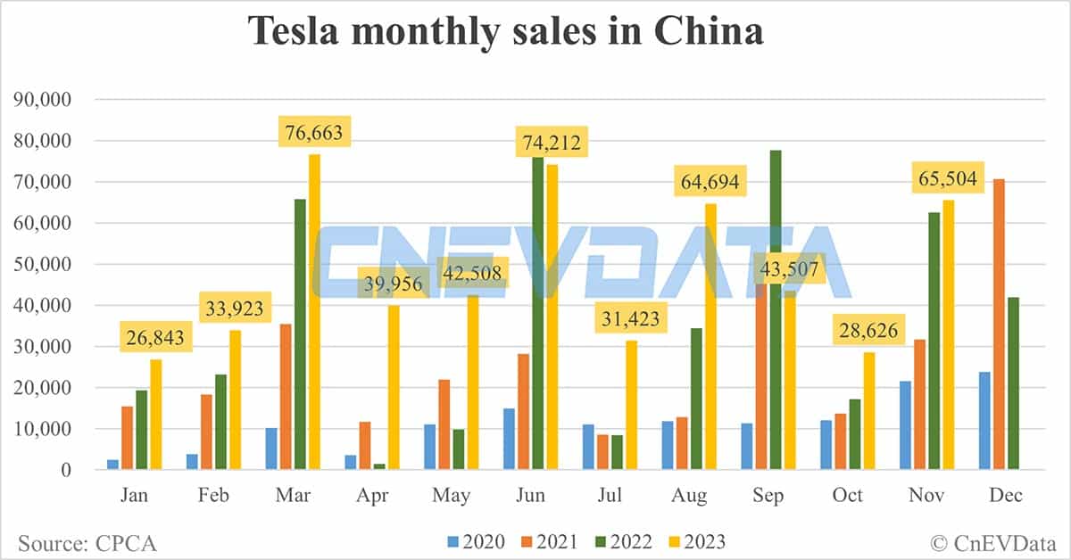 Tesla sold 853,603 China-made vehicles in the January-November period, up 30.31 percent from the same period last year.