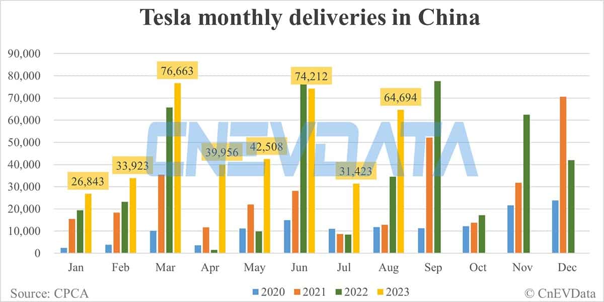 Tesla delivered 64,694 vehicles in China in August, and it exported 19,465 from the Shanghai plant.