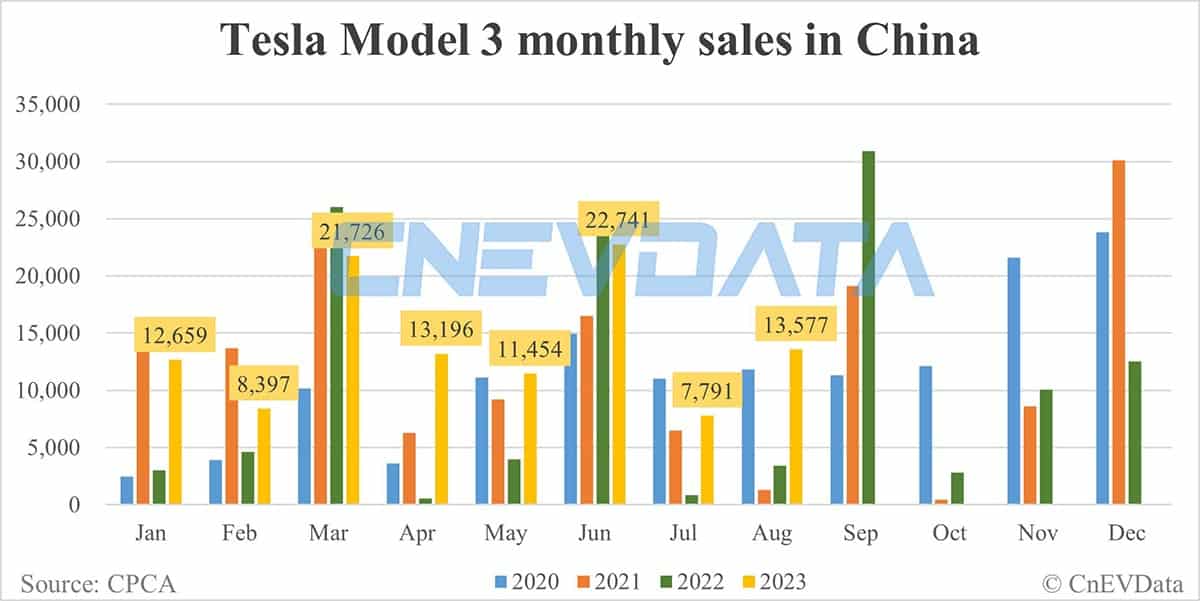 Tesla Aug sales in China: Model 3 at 13,577, Model Y at 51,117