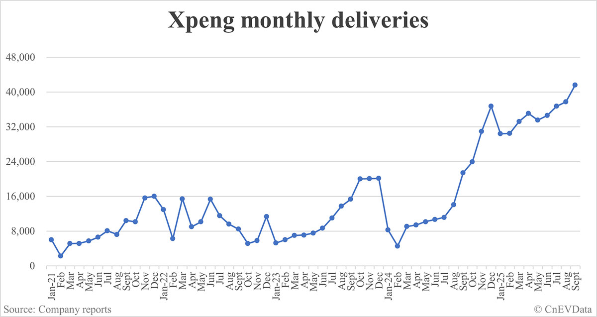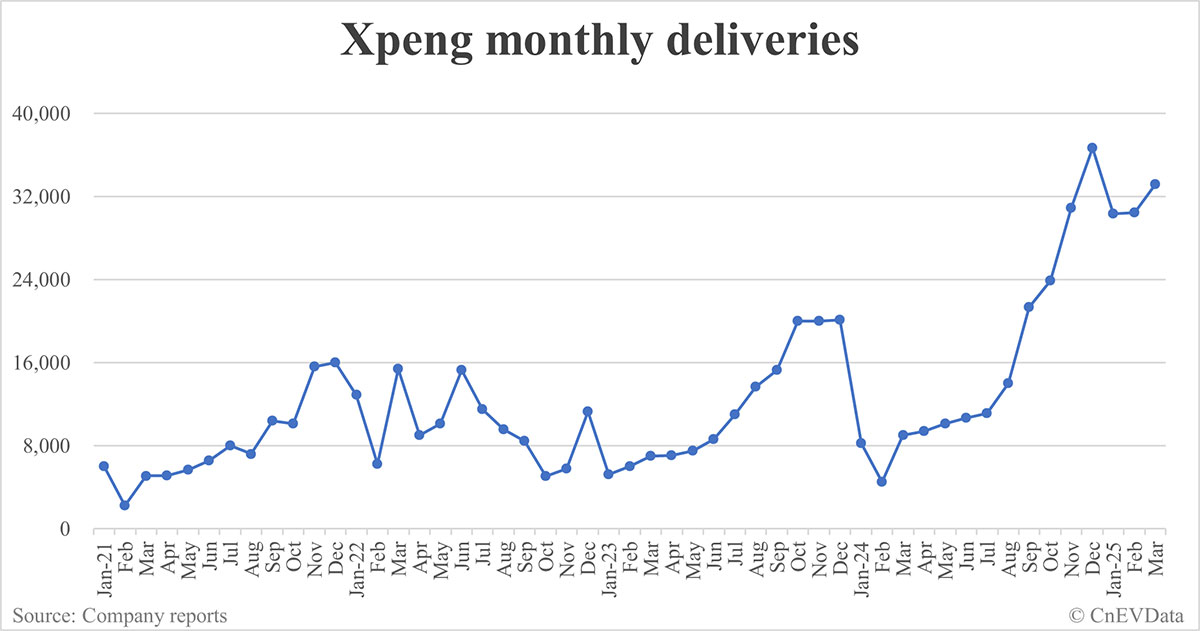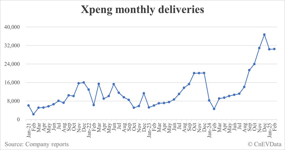 Xpeng delivered 60,803 vehicles in January-February, up 375.21 percent from the same period last year.